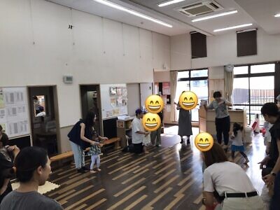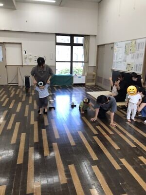 ノリノリの子、いつもの支援センターとは違う様子にキョロキョロしてしまう子もいましたが、動いて体がほぐれたところで・・・。