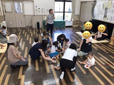 上手く投げて入れる子、カゴぎりぎりまできてポトンと落としていく子と様々。ママ達も頭を使いながら参加してくれていました。カゴ目掛けて必死な子ども達の表情が見られました!